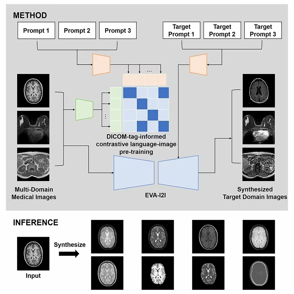 On August 11, 2025, Tan Tao team of the Macao Polytechnic University and ritse Mann team of the medical center of the University of nemegen in the Netherlands published a research paper entitled "all in one medical image to image translation" in cell reports methods, a journal of cell press. This study proposes an eva-i2i framework driven by contrast language image pre training (dclip) with DICOM semantic tags, which can realize image conversion between different modes in a single model, and has the potential of zero sample domain adaptation, and can be directly deployed to clinical tasks without fine-tuning.